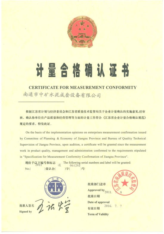 江蘇省質量技術監督局于2011629——30日對南通市中礦水泥成套設備有限公司進行計量認證評審。通過查看文件,現場觀察實驗以及設備的評定,南通市中礦水泥成套設備有限公司達到了《產品質量檢驗機構計量認證/審查認可(驗收)評審準則》的要求,并于201178日獲得了計量認證證書。計量認證為政府執法部門打擊假冒偽劣商品提供了有力的技術保障,為審判機關裁決因產品質量引發的案件提供了準確的技術依據,為商業貿易雙方提供了公證的檢驗結果,為機械行業設備和工程項目出據了科學、準確、可靠的檢測數據。從整體上講,質量認證、審查認可工作為提高產品質量水平、全民質量意識、國家建設做出了不可磨滅的貢獻。在產品質量檢驗和檢測等領域《計量認證》列為檢驗市場準入的必要條件。