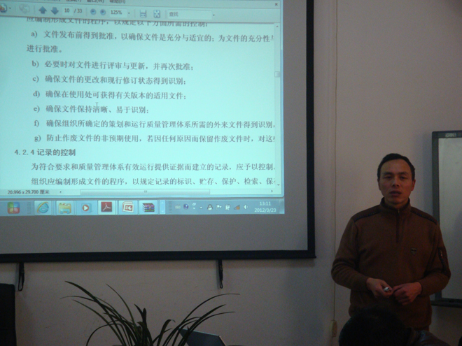 3.23日,公司聘請(qǐng)ISO9000管理體質(zhì)培訓(xùn)講師王兵老師對(duì)全體職員進(jìn)行培訓(xùn)學(xué)習(xí)。王老師以其豐富的現(xiàn)場(chǎng)管理經(jīng)驗(yàn),領(lǐng)導(dǎo)完成多項(xiàng)生產(chǎn)、質(zhì)量技術(shù)改造工程;策劃和推行以過(guò)程為導(dǎo)向的質(zhì)量有效控制與現(xiàn)場(chǎng)持續(xù)改善活動(dòng),解決公司產(chǎn)品的關(guān)鍵質(zhì)量問(wèn)題,大大提高了產(chǎn)品的合格率。王老師在生產(chǎn)管理、質(zhì)量管理培訓(xùn)領(lǐng)域有豐富的授課經(jīng)驗(yàn),講授公開(kāi)課暨企業(yè)內(nèi)訓(xùn)三百多次。講課主要特點(diǎn)是能針對(duì)不同的企業(yè)特點(diǎn)、學(xué)員層次、結(jié)合企業(yè)的實(shí)際情況采用不同的授課方式和內(nèi)容。