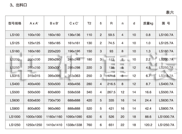 出料口的結果表示如下圖,系由鋼板折成的方形管及法蘭焊接而成,不帶能關閉的出料口控制機構,在使用時將出料口焊于機殼上,其法蘭面與溜槽法蘭相連,裝配出料口的機殼還應按出料口的內孔尺寸開孔。