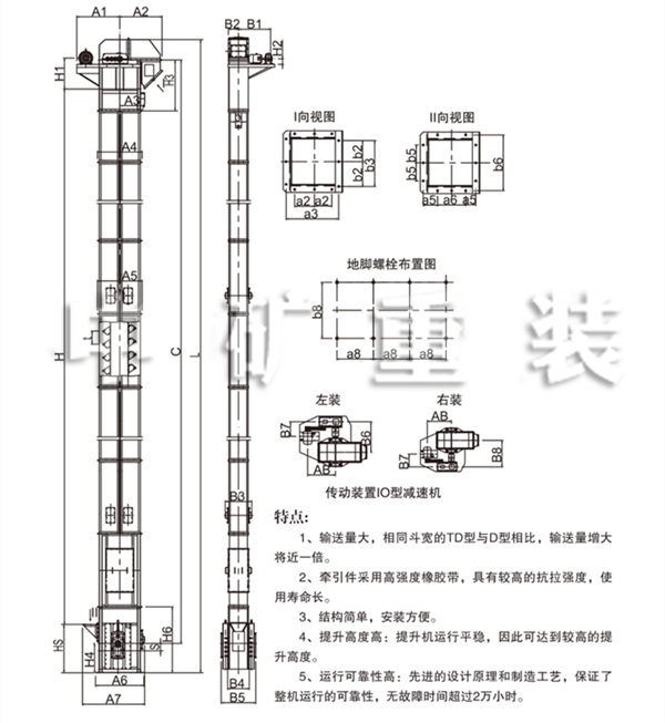 TD型斗式提升機適用于垂直輸送粉狀、粒狀,及小塊狀的磨琢性較小的散狀材料,如糧食、煤。水泥、碎礦石等,提升高度40m,其特點為結構簡單,運行平穩(wěn),挖取式裝料,離心式卸料,物料溫度普通膠帶不超過60℃,夾鋼絲膠帶可達80℃,耐熱膠帶可達120℃,與傳統(tǒng)D型斗提升機相比,輸送效率高,料斗型式多,應優(yōu)先選用。